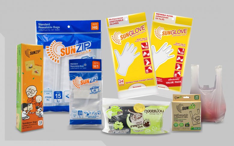 บรรจุภัณฑ์พลาสติก Sun Products (ทานตะวันอุตสาหกรรม) ผลิตภัณฑ์คุณภาพดีทั้งหมดมี ถุงซิปล็อค, ถุงขยะ, ถุงมือ, ถุงช็อปปิ้ง,ถุงเติมบุญตักบาตร หลายขนาดให้เลือก